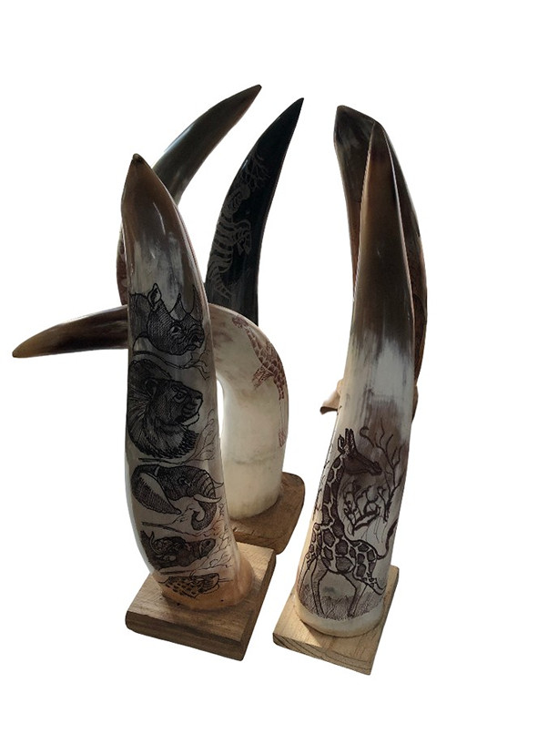 Transform your space with our exquisite set of five cow horns, featuring intricate designs inspired by the majestic Big Five. Each cow horn is a stunning piece of art, showcasing unique patterns that celebrate the beauty of wildlife. Perfect for home decor, these horns add a touch of elegance and a hint of adventure to any room. Elevate your interior design with this captivating collection that embodies the spirit of nature.